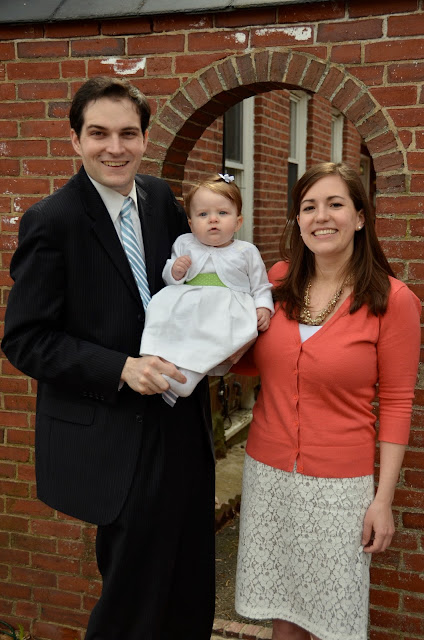 Nell wore the sweetest little Pottery Barn Kids dress I had found at a consignment store a couple of months ago. I didn't even know they made clothes, but it was a beautiful dress, very well-made, with a pale green polka dot sash. I found her a little cardigan to go over it at Target.