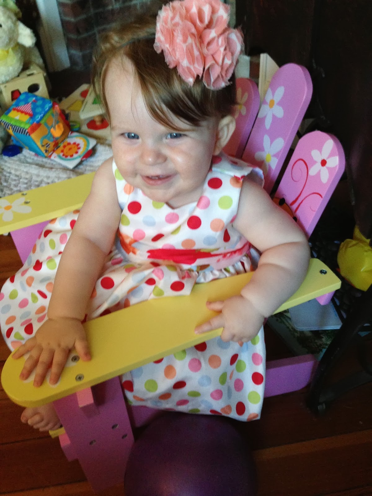 She received this little chair for her birthday from soon-to-be-aunt-Hannah's parents, and was so very pleased with it. She loves to sit in it and survey the living room from her elevated perch.